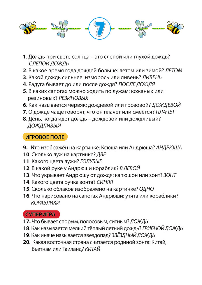 В игре целых 40 карточек и 800 вопросов! Пройдите своей фишкой первым от Старта до Финиша по игровой дорожке игры "Наша Планета", по очереди правильно отвечая на вопросы карточек. Чтобы выиграть, нужно развить хорошую зрительной памятью, ведь многие ответы расположены на соответствующих картинках игрового поля и на фасадах вопросников.
