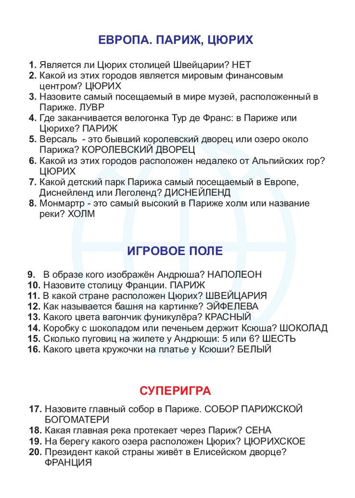 В окружении соперников по игре, которые так же жаждут победы, вам будет гораздо интереснее открывать карточки с новыми городами и отвечать на вопросы! Картинки на полях и фасадах помогут вам более точно сформировать представления о городах и запомнить интересные сведения о каждом из них.